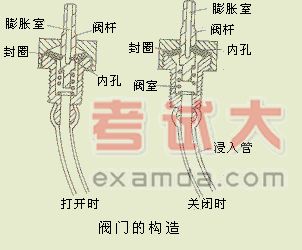 (1)一般阀门系统:由封帽、橡胶封圈、阀门杆、弹簧、浸入管、推动钮组成。其中阀门杆是重要部分,由塑料或不锈钢制成,上端有内孔和膨胀室,下端有一段细槽供药液进入定量室,内孔是阀门沟通容器内外孔道,关闭时被弹性橡胶封圈封住,容器内外不通,当掀下推动钮时,内孔与药液相通,容器内容物通过内孔进入膨胀室而喷射出来。 [阀门的构造]