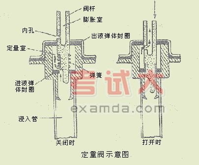 (2)定量阀门:除具有一般阀门各部件外,还有一个塑料或金属制的定量室或称定量小杯,它的容量决定每次用药剂量。[定量阀示意图]