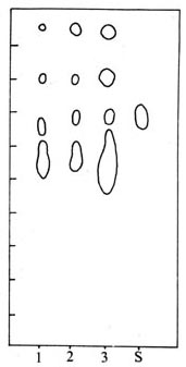 1. 取本品5g,剪碎,加水100ml,室温浸过夜,滤过,滤液浓缩至20ml.取浓缩液3~5ml,加三氯化铁试液3滴,即生成棕色沉淀,再加0.1mol/L氢氧化钠溶液3滴,振摇,沉淀即溶解。(检查甘露醇) 2. 取上述浓缩液3ml,加硝酸1滴,硝酸银试液数滴,生成的黄色乳状沉淀。在氨试液中应微溶,在硝酸中不溶。(检查碘) 3. 薄层层析。样品制备:取本品3.5g,加70%乙醇50ml,回流半小时,提取液蒸干,残渣用70%乙醇3ml溶解,离心5分钟,取澄清液供点样用。吸附剂:硅胶H(青岛海洋化工厂)-1%CMC.展开剂:正丁醇-丙酮-水(3:4:3)。展距10cm.显色剂:高锰酸考试,大收集整理钾试液(0.02mol/L),显色后,斑点现黄色,放置数日,背景为土黄色,斑点呈白色。