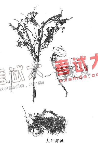2. 海蒿子(大叶海藻):常卷曲皱缩成团,黑色,表面有白色粉霜,质脆,浸水膨胀后,可见全体呈考试,大收集整理树枝状,橄榄棕色,略粘滑,柔韧。固着器常已除去。主干圆柱状,粗糙,常单一。叶披针形、线形至丝状。气囊生于细分枝上,呈球形。气微腥,味粘而微咸。