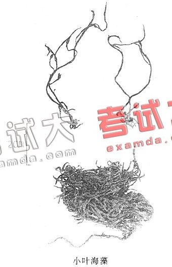 1. 羊栖菜(小叶海藻):常卷曲皱缩成团,棕黑色,表面常因甘露醇析出致被白色粉霜,质硬脆,浸水膨胀展开后,可见全体呈树枝状,黄棕色,肉质肥厚,粘滑而有弹性。固着器须根状。主干圆柱形,直径1~3mm,表面光洁。叶为狭倒披针形,先端膨大中空。气囊腋生,纺缍形,长5~10mm,具短柄。生殖托考,试大收集整理不常见。气微腥,味粘而微咸。1. 羊栖菜(小叶海藻):常卷曲皱缩成团,棕黑色,表面常因甘露醇析出致被白色粉霜,质硬脆,浸水膨胀展开后,可见全体呈树枝状,黄棕色,肉质肥厚,粘滑而有弹性。固着器须根状。主干圆柱形,直径1~3mm,表面光洁。叶为狭倒披针形,先端膨大中空。气囊腋生,纺缍形,长5~10mm,具短柄。生殖托不常见。气微腥,味粘而微咸。