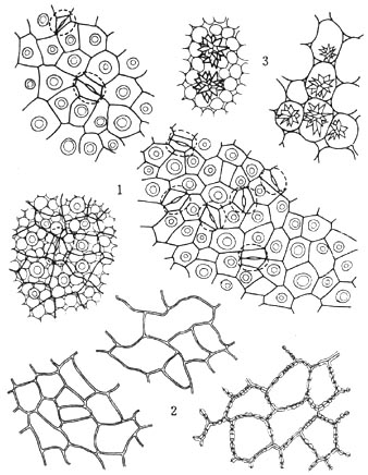 1.叶上表皮细胞 2.叶下表皮细胞 3.草酸钙簇晶