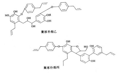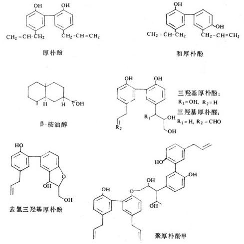 厚朴树皮含厚朴酚(magnolol)、和厚朴酚(honokiol)、异厚朴酚(isomagnolol)。最近报道从厚朴的乙酸乙酯部分中得到三羟基厚朴酚、去氢三羟基厚朴酚、三羟基厚朴醛、聚厚朴酚甲、及聚厚朴酚丙。厚朴的挥发油主成分为桉油醇(eudesmol),含量高达94%~98%.此外,尚含少量α-蒎烯、柠檬烯、乙酸龙脑酯。从厚朴中考,试大收集整理分出的生物碱有木兰箭毒碱(magnocurarine)、木兰花碱(magnoflorine)、鹅掌楸碱(liriodenine)、柳叶木兰碱(salicifoline)、白兰花碱(michelabine)、和番荔枝碱(anonaine)。从凹叶厚朴树皮中分得厚朴酚、和厚朴酚、α-桉油醇和β-桉油醇。滇缅厚朴含厚朴酚、和厚朴酚及木兰箭毒碱。