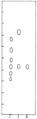 6. 薄层层析。样品制备:取儿茶细粉1g,加甲醇10ml溶解,滤过,滤液供点样用。吸附剂:0.5%CMC硅胶G板(青岛海洋化工厂),105℃活化半小时。展开剂:氯仿-甲醇-甲酸(8:2:0.08)。展距:16cm.显色剂:喷含1%盐酸的0.05%对二甲氨基苯甲醛乙醇溶液,儿茶素斑点显紫色。