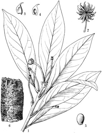 大八角Illicium majus Hook. f. et Thoms. 1.花枝 2.果 3.骨突 4.骨突纵切面 5.种子放大 6.树皮