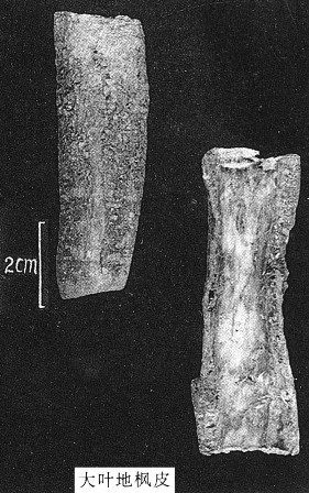 大叶地枫皮,又称桂林地枫皮,为大八角Illicium majus Hook. f. et Thoms.的树皮,自1960年后地枫皮产量下降,不够供应而收购桂林地区产的本品作地枫皮用,1964年因在内蒙、江苏一带使用引起中毒而停止收购。本品与地枫皮的主要区别为:高大乔木, 叶长椭圆状披针形或倒披针形,顶端渐尖。花粉红或红色;花梗长2~6cm;雄蕊12~21枚;成熟心皮常为13~14枚;果直径可达4.5cm.生于海拔230~2000m的山坡和溪边林中。分布于广东、广西、湖南、四川、贵州等省区。树皮挥发油含量0.05%,折光率n20D=1.4949.据北京中医学院中药系分考试,大收集整理析挥发油成分含有27个化合物,其中和地枫皮相同的有芳樟醇、龙脑(borneol)、萜品烯醇-4,α-松油醇、黄樟醚、乙酸萜品酯、β-榄香烯、甲基丁香酚、α-佛手柑油烯 (α-bergamotene)、葎草烯(humulene)、别香橙烯(allo-aromadendrene)、γ-衣兰油烯、α-衣兰油烯、γ- 杜松烯(γ-cadinene) 、δ-杜松烯、4,10-二甲基-7-异丙基环(4,4,0)-1,4癸二烯,(4,10-dimethyl-7-isopropyl-bicyclo(4,4,0)-1,4-decadiene)、榄香素(elemicin)、1,6-二甲基-4-异丙基萘;和地枫皮不同的有牻牛儿醛(geranial)、牻牛儿醇 (geraniol) 、乙酸龙脑酯(bornyl acetate)、胡椒烯(copaene)、β- 甜没药烯(β-bisabolene)、异榄香素(isoelemicin)、正廿烷(nheptadecane)、酞酸二丁酯(diisobutyl-phthalate)。树皮呈卷筒状、槽状,长16~46cm,宽3~7cm,厚3~5mm,外表面深棕色至灰棕色,有横或纵沟纹,有的可见灰白色地衣斑,皮孔卵形或横长,栓皮不易脱落。内表面棕黄色或灰棕色,较平滑。质较坚硬,断面颗粒性。气芳香,味微辛而涩。横切面主要特征为:石细胞群主要分布于皮层,射线较长,约为整个皮部的1/2,由2~3列细胞组成……本品水浸泡后有大量粘液渗出。本品乙醇浸提液点于滤纸上在紫外光灯(365nm)下观察斑点呈棕红色。氯仿浸提液点于滤纸上在紫外光灯(365nm)下斑点呈紫蓝色。薄层层析条件同地枫皮。(见图)