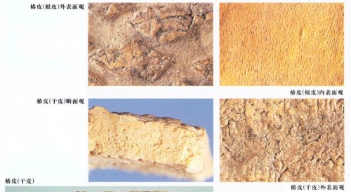 根皮呈扁平块片或不规则卷片状,长宽不一,厚2~5~10mm,外表面带灰黄色或黄棕色,粗糙,皮孔明显,纵向延长,微突起,有时外面栓皮剥落,呈淡粉色;内表面淡黄色,较平坦,密布细小梭形小点或小孔。质坚脆,折断面强纤维性,易与外皮分离。有油腥臭气,折断后更甚,味苦。干皮多呈扁平块状,厚约3~5mm或更厚;外表面暗灰色至灰黑色,具不规则纵横裂纹,皮孔大,去栓皮后呈淡棕黄色;折断面颗粒性。
