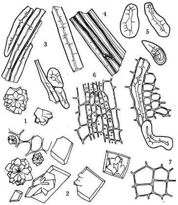 1. 草酸钙簇晶 2.草酸钙方晶 3.韧皮纤维 4.钉刺中纤维 5.石细胞 6.分泌道 7.木栓细胞