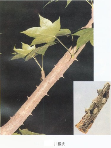 树皮呈片状或微卷曲的不规则块片,厚0.2~1cm.外表面黑褐色,较薄者为灰棕色,粗糙,多呈不规则鳞片状裂纹,并有棕褐色菱形皮孔;钉刺分布较密,呈扁圆锥形,纵向着生,高约1cm,顶端锐尖,基部直径0.5~2.5cm,较大钉刺上可见环纹。内表面黄棕色,有斜网状细条纹。质脆,易折断,断面略呈层片块。
