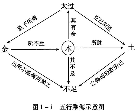 相乘和相侮,都是异常的相克现象,两者之问既有区别又有联系,相乘与相侮的主要区别是:前者是按五行的相克次序发生过强的克制,从而形成五行间相克关系的异常;后者则是与五行相克次序发生相反方向的克制现象,从而形成五行间相克关系的异常。两者之间的联系是在其发生相乘时,也可同时发生相侮;发生相侮时,也可以同时发生相乘。如:木过强时,既可以乘土,又可以侮金;金虚时,既可以受到木的反侮,又可以受到火乘。以木为例图示如下,就是对五行之间相乘与相侮及其相互关系的很好说明。