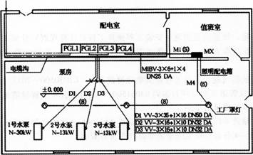 ③三台水泵动力电缆D1、D2、D3分别由PGL2、3、4低压开关柜引出,沿电缆沟内支架敷设,出电缆沟再改穿埋地钢管(铜管埋地深度一0.2m)配至1号、2号、3号水泵电动机。其中:D1、D2、D3回路,沟内电缆水平长度分别为2m、3m、2m;配管长度为:15m、12m、13m,连接水泵电机处电缆预留长度按1.0m计。