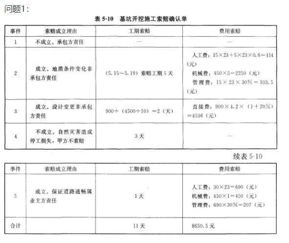 事件2:施工过程中,因遇软土层,接到工程师5月15日停工的指令,进行地质复查,配合用工15个工日,窝工5个工日(降效系数0.6)。
