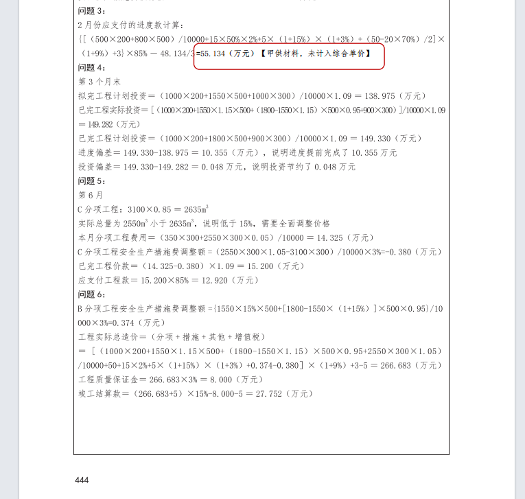 勘误15:案例一本通勘误:P144:问题3:2月份应支付的进度款=55.134(万元)。甲供材料不需要扣除,24清单计价标准,甲供材料未计入综合单价中。