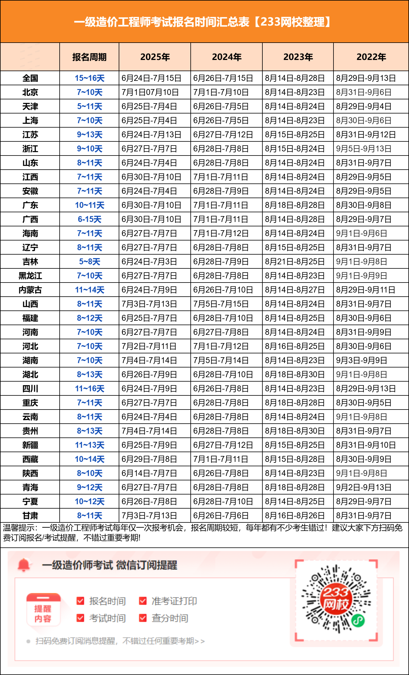 一级造价工程师考试每年仅一次报考机会,报名周期较短,不能补报名,准备报考2026年一级造价工程师考试的同学,请密切关注中国人事考试网及各省考试中心通知。