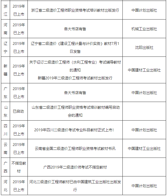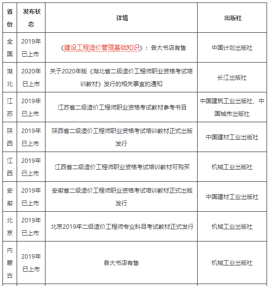 二级造价工程师考试教材由各省自行出版发行,目前现在各省已发行的二级造价工程师教材都是最新版,预计2020年开考地区将会继续沿用2019版二级造价工程师考试教材。准备参加2020年二造考试的考生可以根据上表,购买教材学习即可。