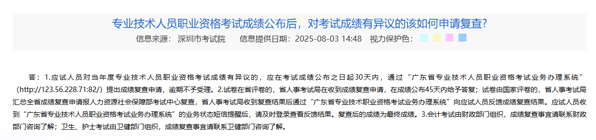 答:1.应试人员对当年度专业技术人员职业资格考试成绩有异议的,应在考试成绩公布之日起30天内,通过“广东省专业技术人员职业资格考试业务办理系统”(http://123.56.228.71:82/)提出成绩复查申请,逾期不予受理。2.试卷在省评卷的,省人事考试局在收到成绩复查申请,在成绩公布45天内给予答复;试卷由国家评卷的,省人事考试局汇总全省成绩复查申请报人力资源社会保障部考试中心复查,省人事考试局收到复查结果后通过“广东省专业技术职业资格考试业务办理系统”向应试人员反馈成绩复查结果。应试人员收到“广东省专业技术人员职业资格考试业务办理系统”的业务状态短信提醒后,请及时登录查看反馈结果。复查后的成绩为最终成绩。3.会计考试由财政部门组织,成绩复查事宜请联系财政部门咨询了解;卫生、护士考试由卫健部门组织,成绩复查事宜请联系卫健部门咨询了解。