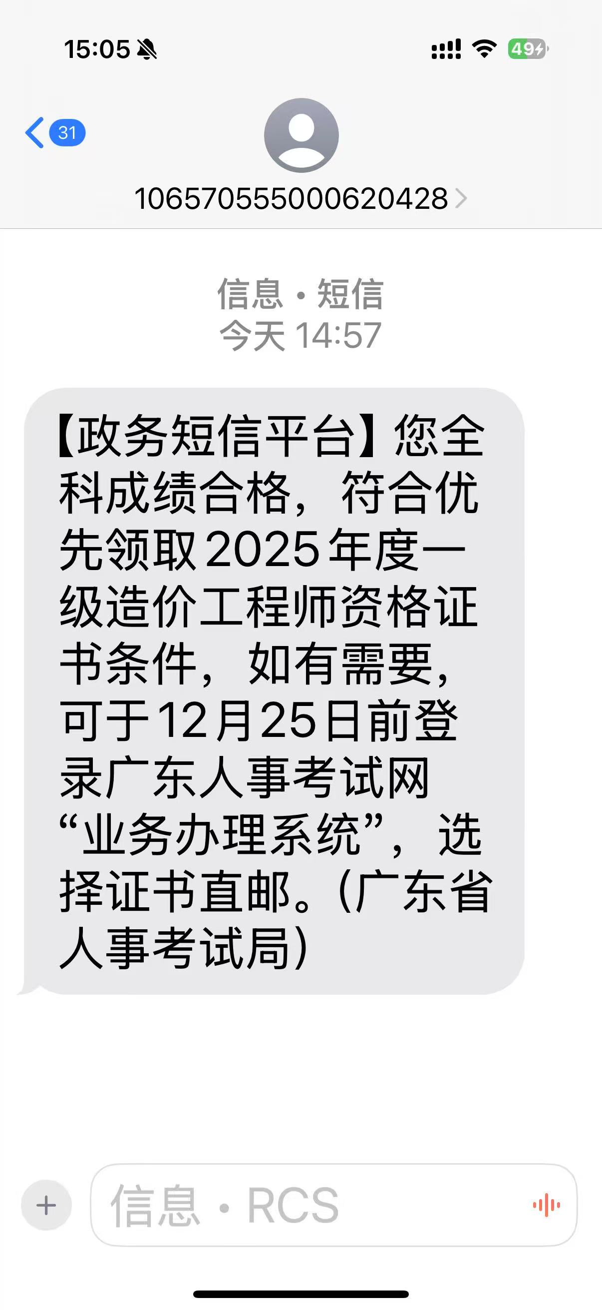 2025年广东一级造价工程师证书可以申请直邮啦!不少考生已经收到广东省人事考试局发送的证书直邮短信通知了,短信内容如下: