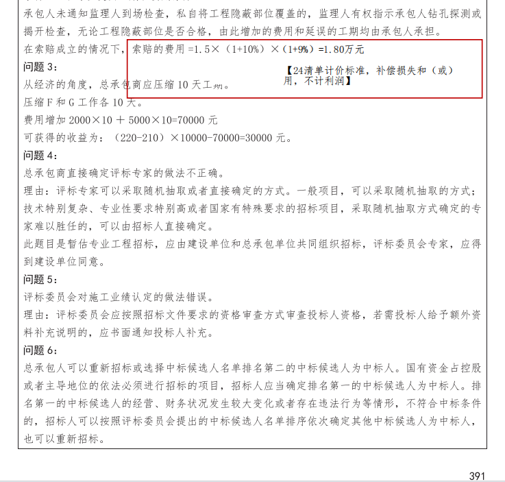 勘误5:146页,问题三:主要材料二次搬运费计算表中,序号4钢材计算错误,更正为:3.99×1.03+0.32=4.43,计算结果更正为:4.43,合价更正为:3544.00;序号5合计更正为:28793.60