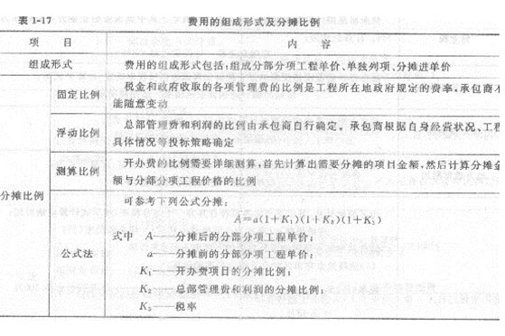 13.费用的组成形式及分摊比例(表1-17)