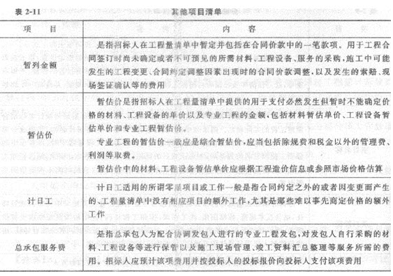4.其他项目清单(表2-11)