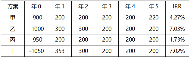 某项目有甲、乙、丙、丁四个互斥型方案,各方案每年初净现金流量(单位:万元)及内部收益率见下表。