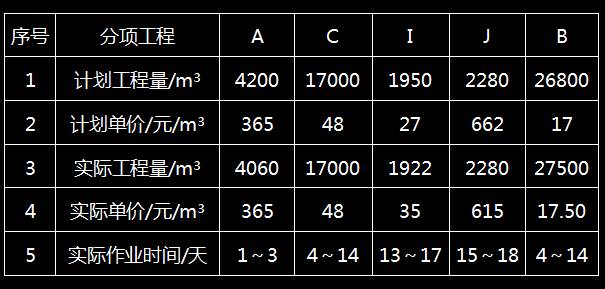 表5.1 部分分项工程计划和实际工程量、单价、作业时间表