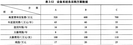 6、某智能大厦的一套设备系统有A、B、C三个采购方案,其有关数据见表2.12。现值系数见表2—13。