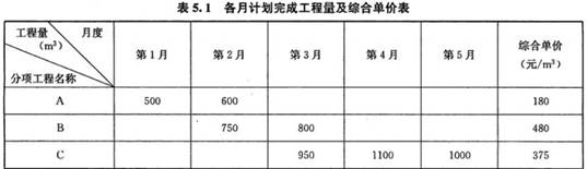 某工程项目由A、B、C三个分项工程组成,采用工程量清单招标确定中标人,合同工期5个月。各月计划完成工程量及综合单价见表5-1,承包合同规定:
