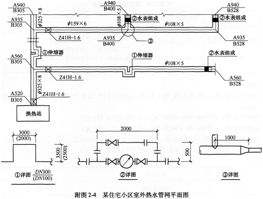 1.本图所示为某住宅小区室外热水管网平面布置图,该管道系统工作压力为1.0MPa,热水温度为95℃。图中平面尺寸均以相对坐标标注,单位以m计,详图尺寸以mm计。