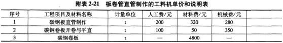 2.按照以下规定:碳钢板卷管安装的损耗率为4%。每制作1t的板卷管直管工程量耗用板材料1.05t;钢卷板开卷与平直的施工损耗率为3%。