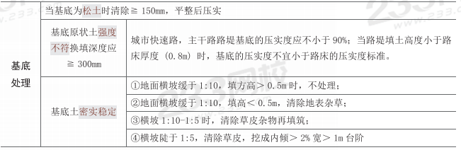 ①当基底为松土时,应先清除有机土、种植土、草皮等,清除深度应达到设计要求一般不小于150mm,平整后按规定要求压实。当基底土质湿软而深厚时,应按软土地基处理。
