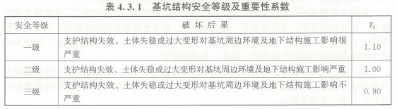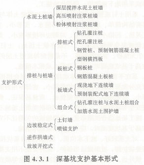 (2)深基坑支护基本形式的选择。深基坑支护形式的选择应综合考虑工程地质与水文地质条件、基础类型、基坑开挖深度、降排水条件、周边环境对基坑侧壁位移的要求基坑周边荷载、施工季节、支护结构使用期限等因素,做到因工程、因地、因时制宜,合理选择,精心施工,严格监控。深基坑支护形式的选择应考虑基坑结构的安全等级(表 4.3.1),对同一基坑的不同部位,可采用不同的安全等级。