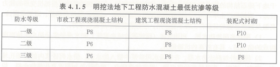 常用的防水混凝土有普通防水混凝土、外加剂或掺和料防水混凝土和膨胀水泥防水混凝土。明挖法地下工程防水混凝土最低抗渗等级如表4.1.5所示。防水混凝土的施工配合比应通过试验确定,强度等级不应低于C25,试配混凝土的抗渗等级应比设计要求提高0.2MPa。寒冷地区抗冻设防段防水混凝土抗渗等级不应低于P10。