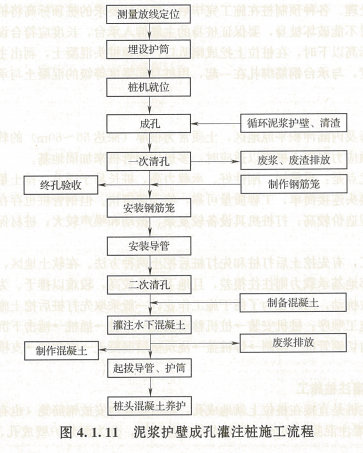 泥浆护壁成孔灌注桩施工流程如图4.1.11所示。灌注桩的桩顶标高至少要比设计标高高出1.0m,桩底清孔质量按不同成桩工艺有不同的要求,应按规范要求执行。
