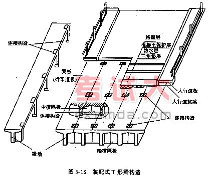 2)肋梁式简支梁桥(简称简支梁桥)。简支梁桥主要用于中等跨度的桥梁。中小跨径在8-12m时,采用钢筋混凝土简支梁桥;跨径在20-50m时,多采用预应力混凝土简支梁桥。在我国使用最多的简支梁桥的横截面形式是由多片T形梁组成的横截面。