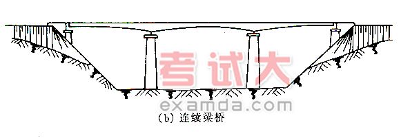 (2) 连续梁式桥和悬臂梁式桥。连续梁桥相当于多跨简支梁桥在中间支座处相连接贯通,形成整体的、连续的、多跨的梁结构。连续梁桥是大跨度桥梁广泛采用的结构体系之一,一般采用预应力混凝土结构。