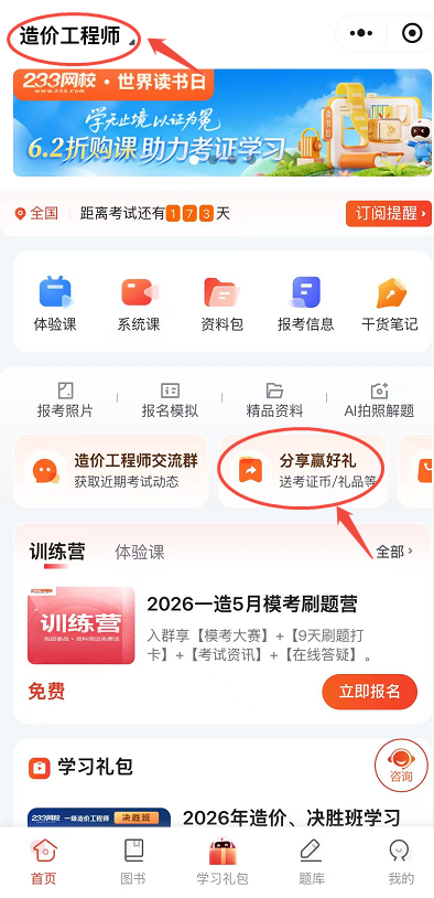 备考2026年一级造价工程师,免不了刷题!5月来一造答题闯关并分享至抖音或小红书!送500个考证币,可免费兑换233商城品牌周边!