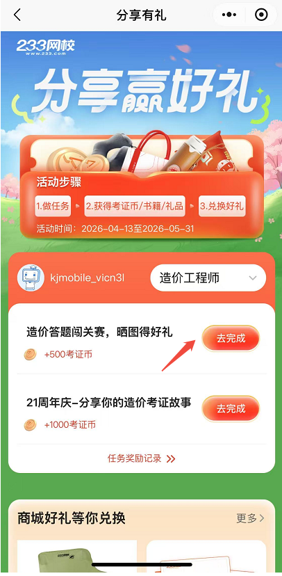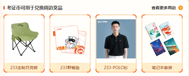 3、活动奖品:500考证币(可以兑换233商城品牌周边或教辅)