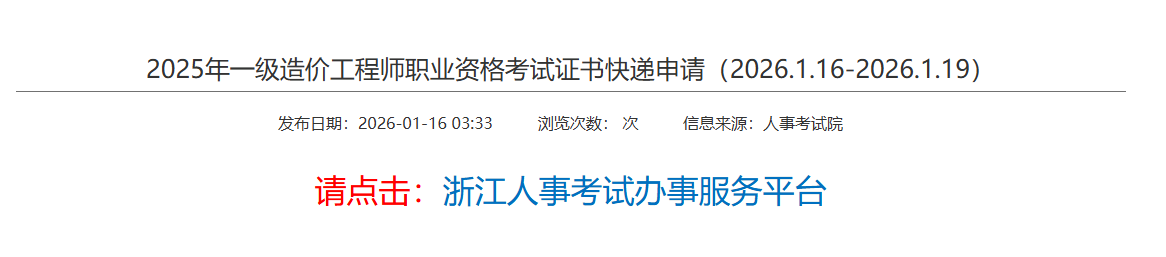 2026月1月16日,浙江人事考试网开通2025年浙江一级造价工程师考试证书快递申请入口,今年考过的同学可以申请证书邮寄了!申请时间:2026年1月16日-2026年1月19日。