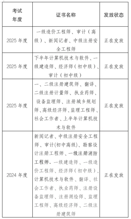 请在中国人事考试网报名所选考区为眉山且未申请省级“证书直邮”的合格人员到眉山市人事考试中心领取合格证书。2025年度一级造价工程师、审计(高级)、新闻记者、中级注册安全工程师等合格证书已完成省级办理流程,现抵达眉山市人事考试中心。证书领取分为现场领取和申请邮寄两种方式,请查询后表确认证书可领取后,按需选择证书领取方式。
