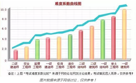 网上流传着这样一张建筑证书考试“难度”排行榜,各个建筑证书因其不同的难度系数占据着不同高度,而造价考试难度系数为5.0左右,略大于一建、咨询、监理,整体上看排名第6。