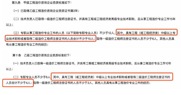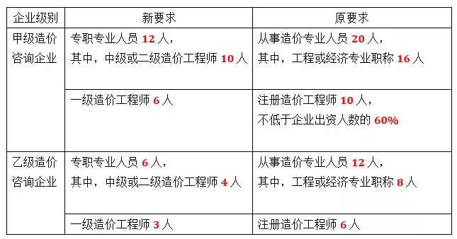 甲级工程造价咨询企业资质标准,一级造价工程师人数要求由10人降低为6人,需要专职从事工程造价专业工作的人员由20人降低为12人。