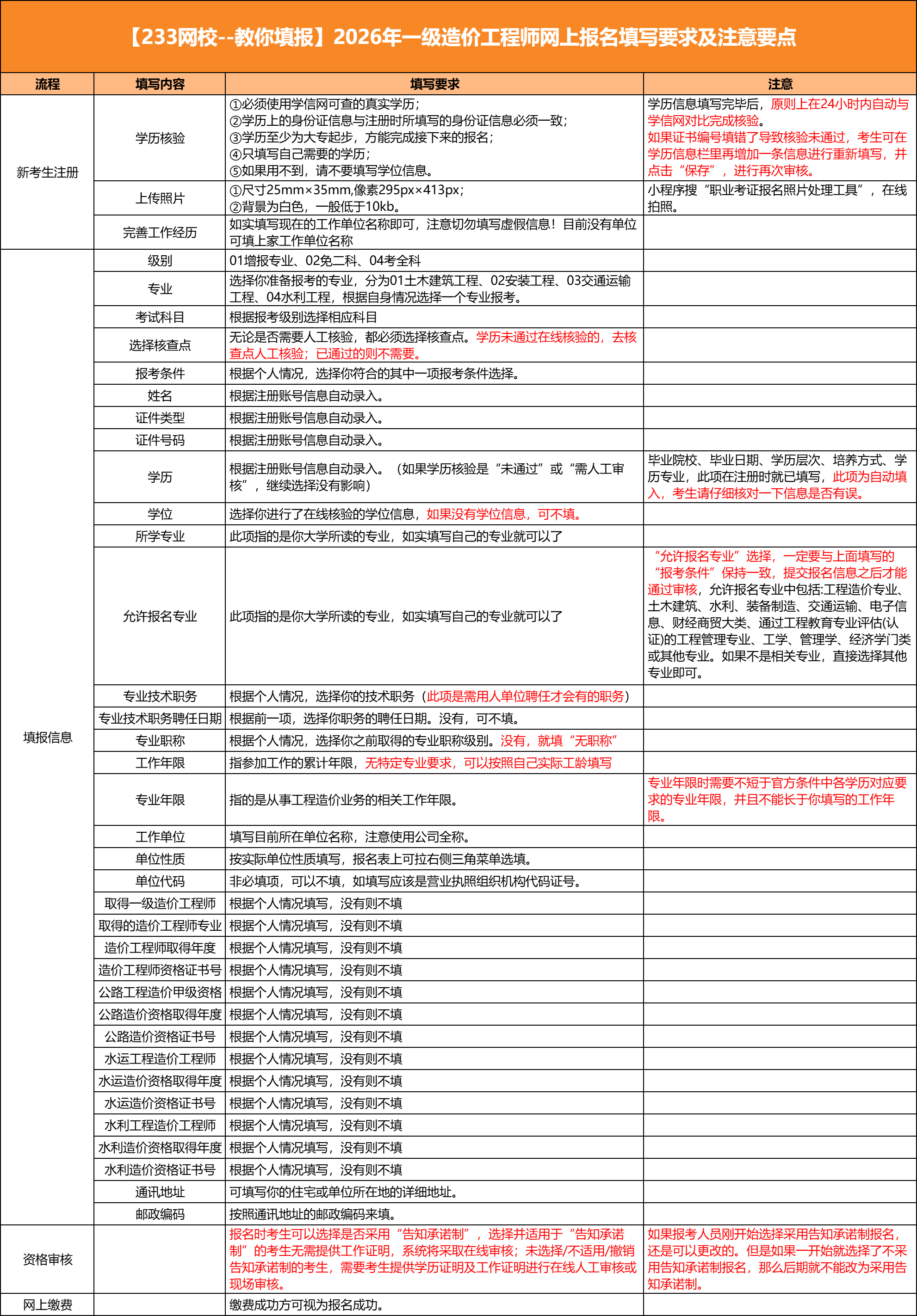 | 2.填写信息 | 填写报考级别(考全科/免二科/增项)、专业(土建/安装等)、工作单位及年限。 | 年限计算:截止日期通常为考试当年的12月31日。全日制学历在读期间的工作经历不计入专业年限。 |