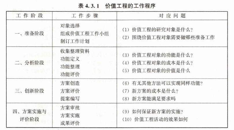 价值工程的工作程序一般可分为准备、 分析、创新、实施与评价四个阶段。其工作步骤实质上就是针对产品功能和成本提出问题、分析问题和解决问题的过程,见表4.3.1。