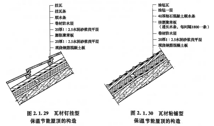 坡屋顶保温节能构造根据屋面瓦材的安装方式不同分为钉挂型和粘铺型两种。