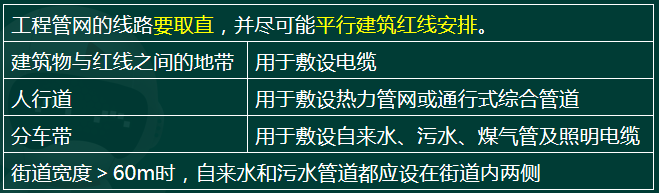 答察解析: 市政管线工程的一般常规做法是:建筑线与红线之间的地带,用于敷设电缆;人行道用于敷设热力管网或通行式综合管道;分车带用于敷设自来水、污水、煤气管及照明电缆;街道宽度超过60m时,自来水和污水管道都应设在街道内两侧;在小区范围内,地下工程管网多数应走专门的地方。