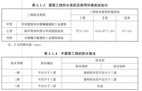 屋面防水工程应根据建筑物的类别、重要程度、使用功能要求确定防水等级,并按相应等级进行防水设防,对防水有特殊要求的建筑屋面,应进行专项防水设计。屋面工程防水等级应依据工程类别和工程防水使用环境类别分为一级、二级、三级。工程类别和工程防水使用环境类别见表2.1.3。防水等级及构造要求见表2.1.4。