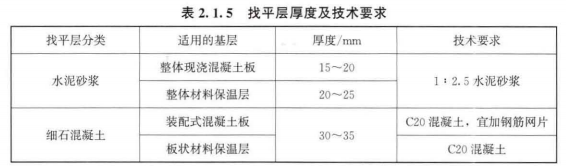 1)找平层。卷材、涂膜的基层宜设找平层,找平层设置在结构层或保温层上面,常用15~25mm厚的1 : 2.5~1 : 3水泥砂浆做找平层,或用C20的细石混凝土做找平层。找平层厚度及技术要求应符合表2.1.5的规定
