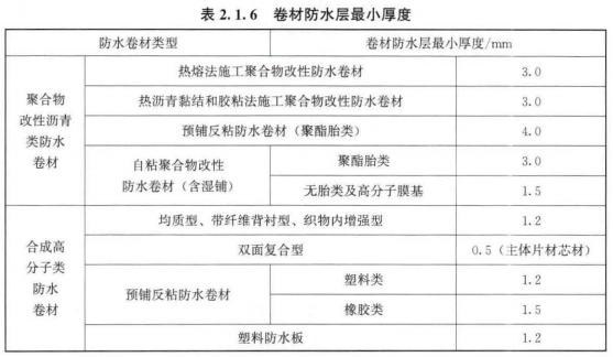 3)卷材防水屋面。防水卷材应铺设在表面平整、干燥的找平层上,待表面干燥后作为卷材防水屋面的基层,基层不得有酥松、起砂、起皮现象。目前卷材防水使用较多的是合成高分子防水卷材和高聚物改性沥青防水卷材,其最小厚度如表2. 1.6所示。
