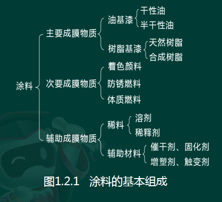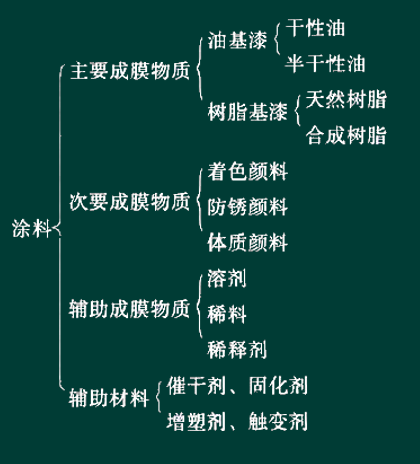 (1)涂料的基本组成。涂料大体上可分为三部分,即主要成膜物质、次要成膜物质和辅助成膜物质,见下图